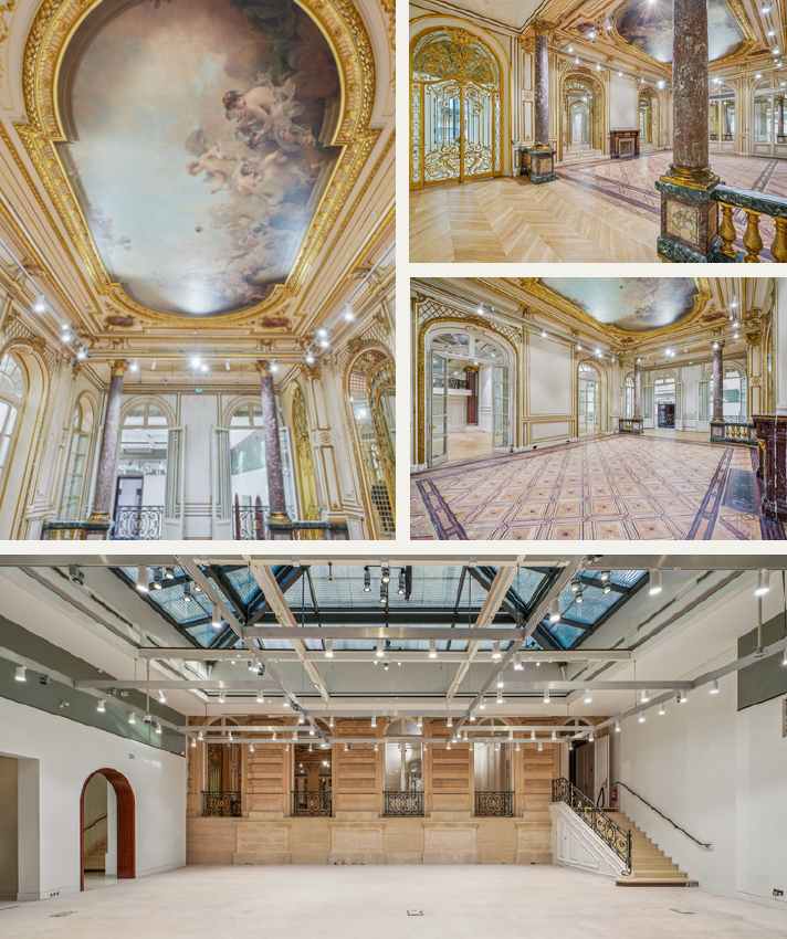 Derrière sa façade classique, deux niveaux au caractère singulier : un atrium baigné de lumière, trois salons haussmanniens aux moulures et dorures délicates, et à l’étage, un vaste plateau d’exposition conçu pour accueillir toutes les mises en scène, showrooms, conférences, défilés ou lancements.